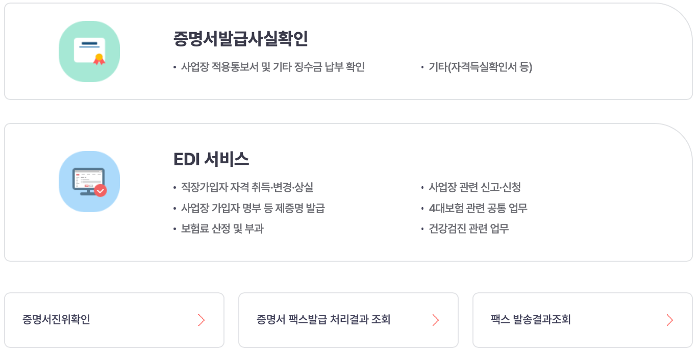 | 보험료 고지납부현황 | 4대보험 완납증명서 | 건강보험 납부확인서 |