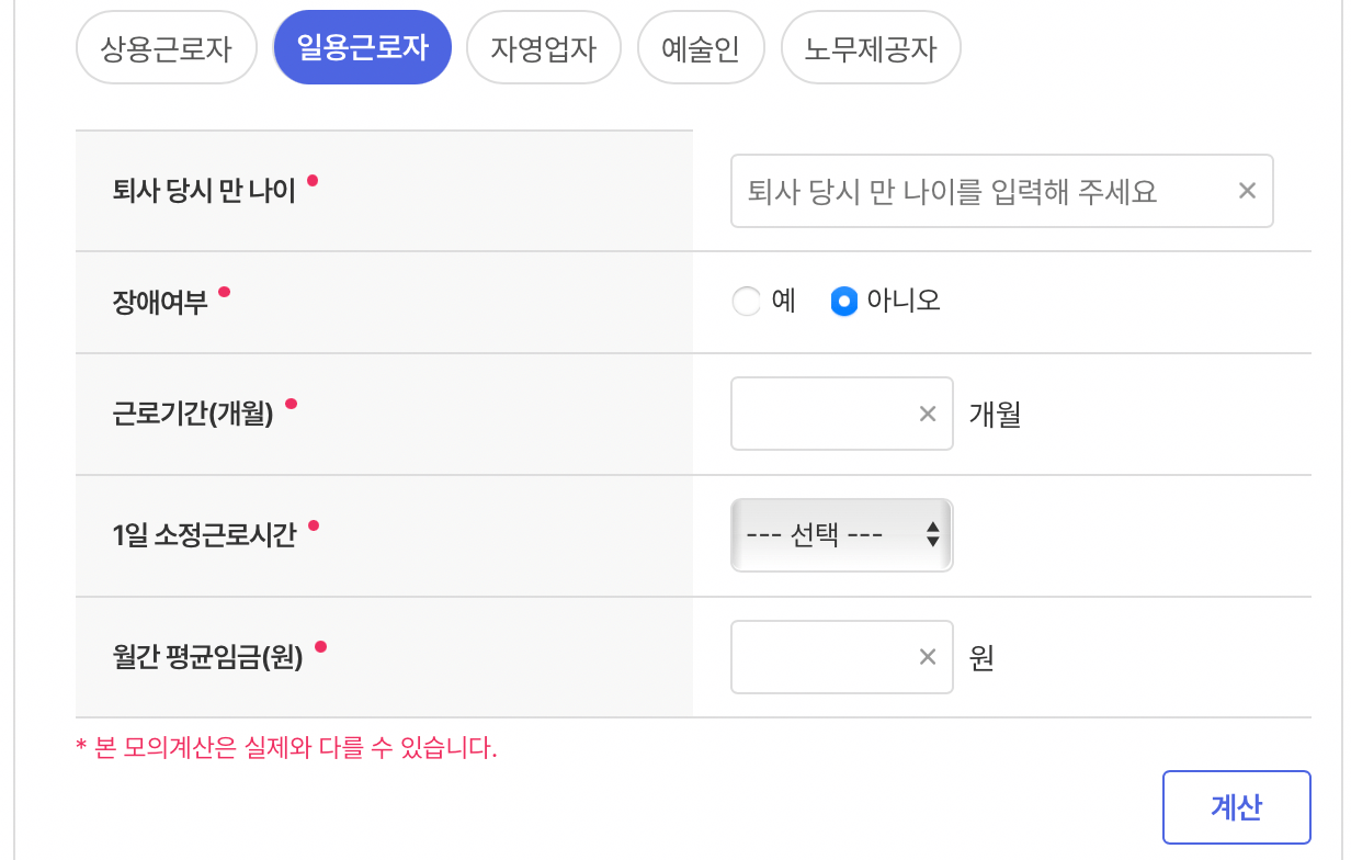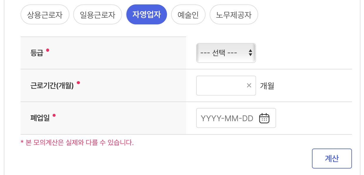 고용24 홈페이지 실업급여 모의계산 코너에서 상용근로자, 일용근로자, 예술인, 노무제공자, 자영업자 실업급여 간편 모의계산 또는 상세 모의계산을 해 볼 수 있습니다.