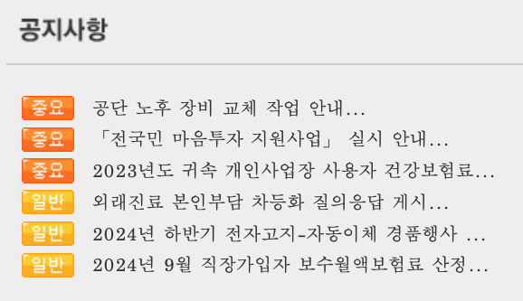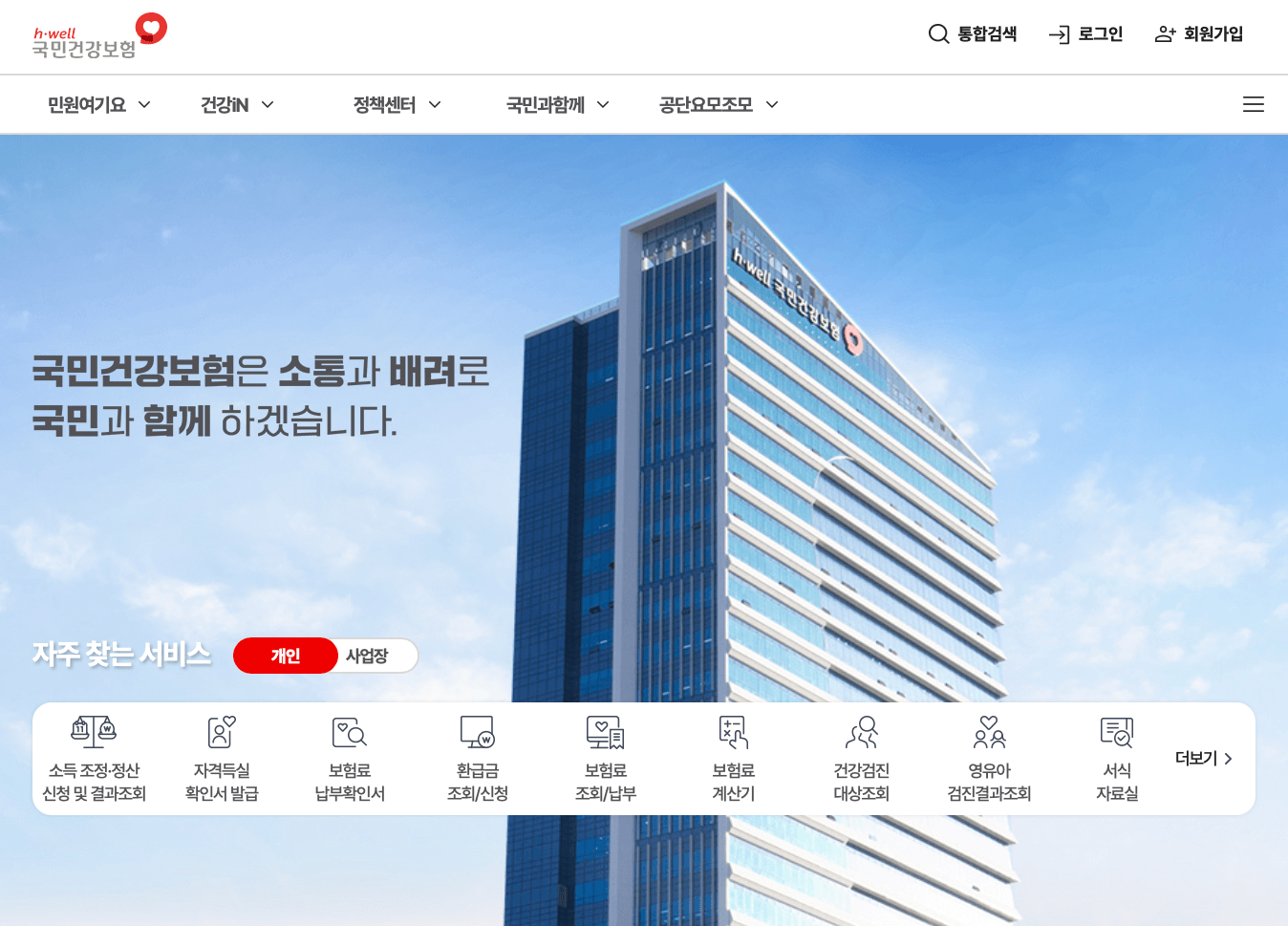 | 개인민원 | 나의 건강관리 | 국민건강보험 | 정보공개 | 공단소개 |