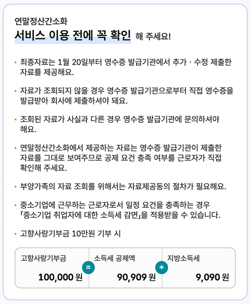 그리고 회사가 연말정산 일괄제공 서비스를 신청하면 근로자의 제공 동의만으로 근로자와 부양가족의 간소화자료를 회사에 직접 제공하므로 근로자가 국세청 홈택스에 접속하거나 세무서에 방문할 필요가 없습니다.
