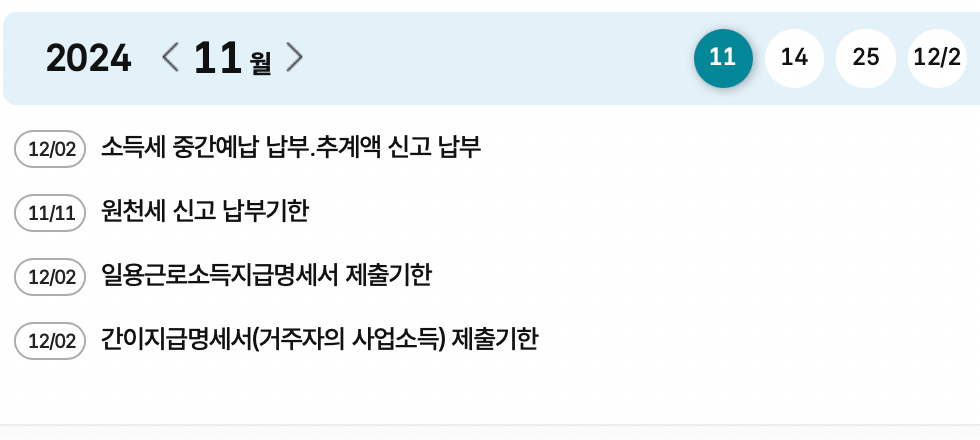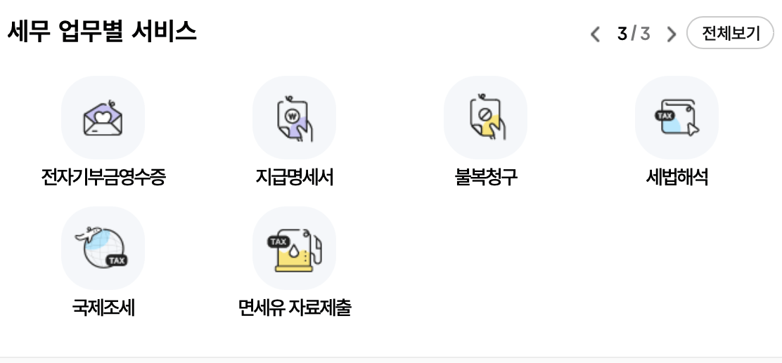 | 전자계산서/현금영수증/신용카드 | 국세증명/사업자등록/세금신청 | 세금신고 |