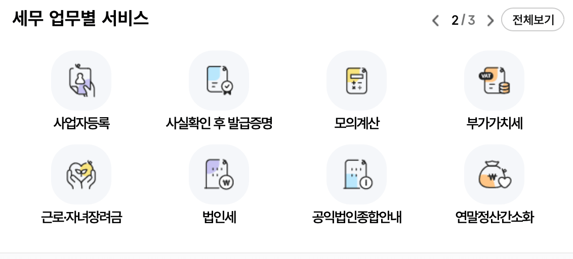 | 전자(세금)계산서 / 현금영수증 / 신용카드 | 국세증명 / 사업자등록 / 세금관련 신청 신고 |