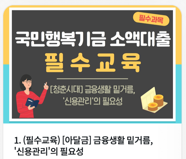 서민금융진흥원 금융교육포털 필수교육으로 '최저신용자 특례보증 필수교육', '불법중개수수료 피해예방 교육', '금융생활꿀팁', '햇살론카드 필수교육', '국민행복기금 소액대출 필수교육' 등이 있습니다.