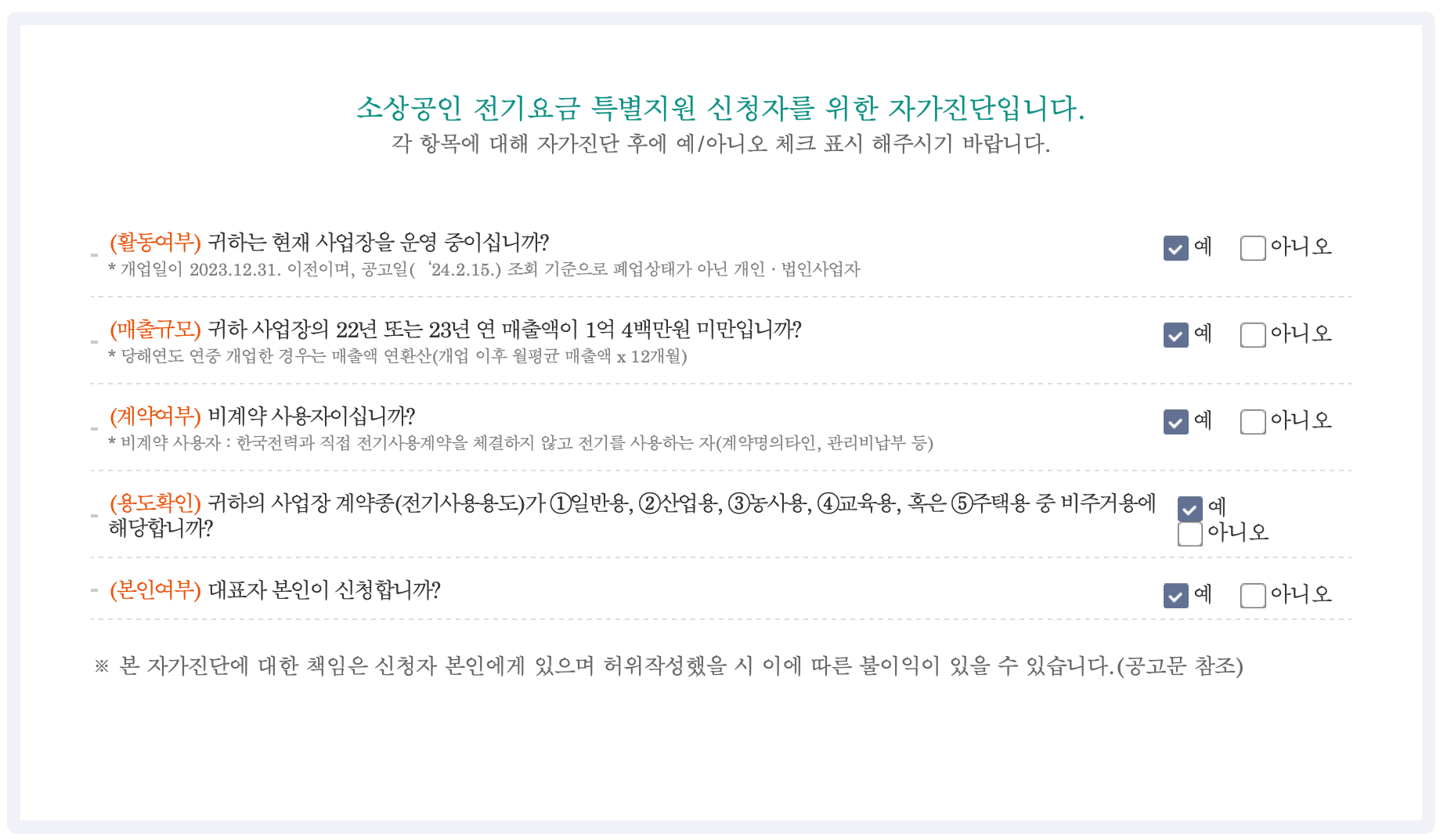 - 단계 2 : 소상공인 전기요금 특별지원 직접계약자 신청 자가진단 -