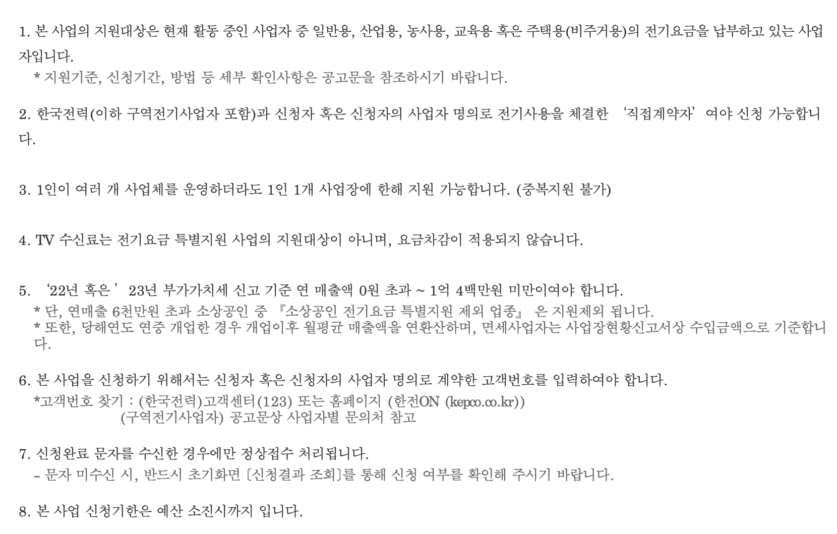 - 단계 1 : 소상공인 전기요금 특별지원 직접계약자 신청 유의사항 안내 -