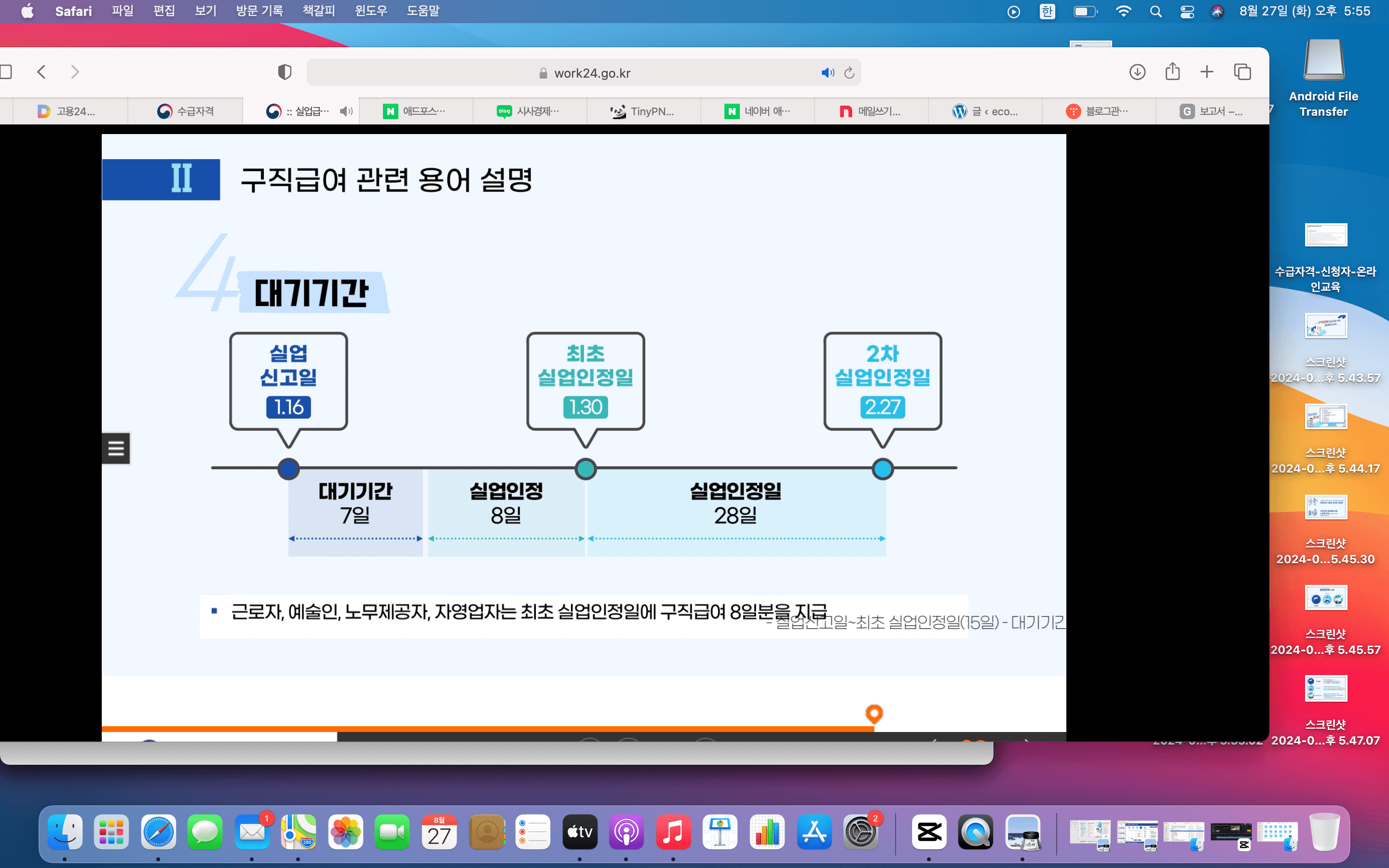 실업급여 수급자격 신청자 온라인 교육을 받기 위해서는 인터넷으로 "고용24" 홈페이지에 접속 후 로그인을 하시면 "구직급여 신청자를 위한 온라인 교육"을 30분 정도 받으시면 됩니다. 교육 받으신 후에 구직신청, 실업인정 신청 등을 하면 됩니다.