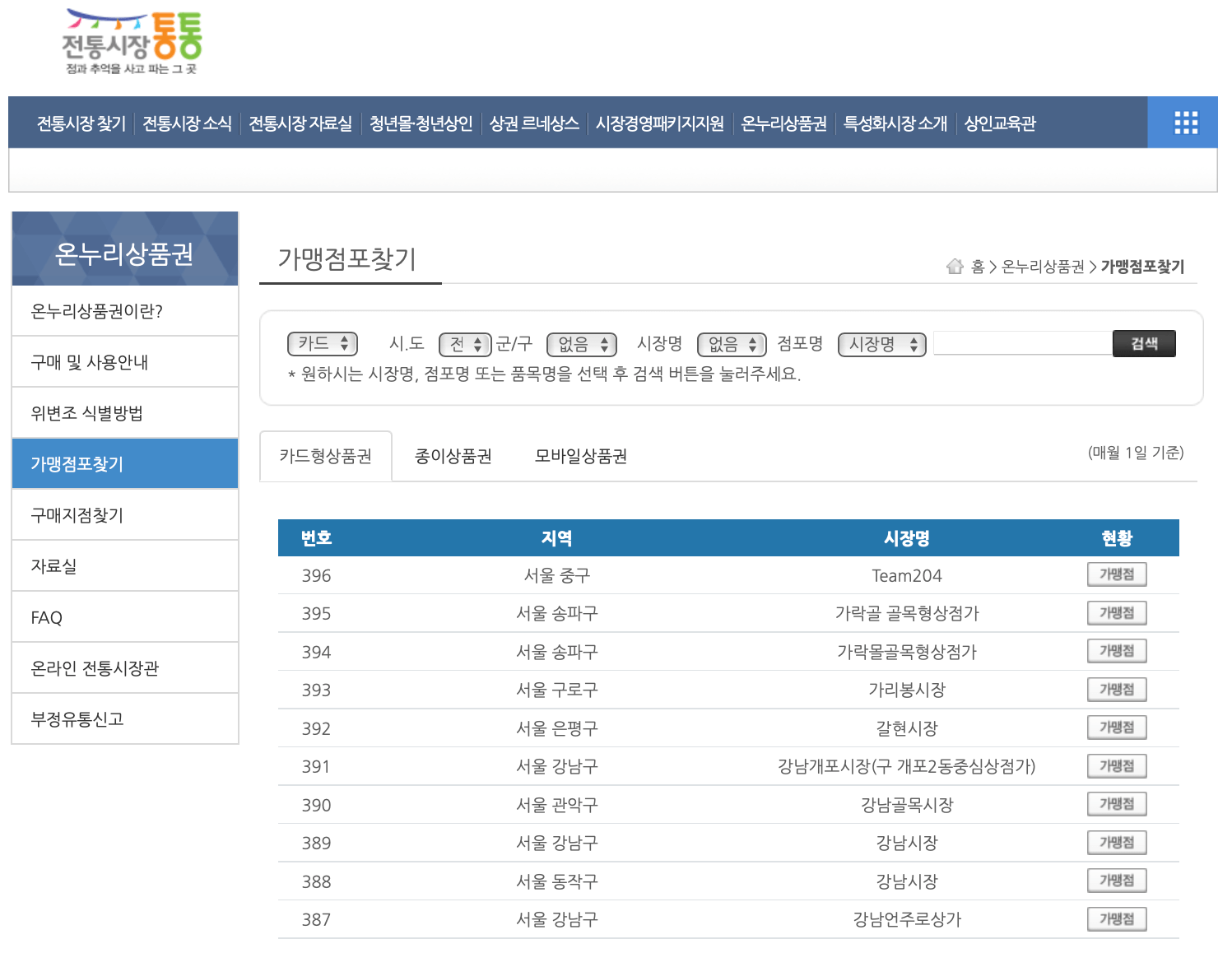 온누리상품권 사용처는 오프라인 가맹점포 내 부착된 온누리상품권 스티커를 확인하시고 사용하시면 됩니다. 아래의 '전통시장통통' 홈페이지 '가맹점포 찾기' 서비스를 통해서 쉽게 오프라인 사용처를 찾을 수 있습니다.