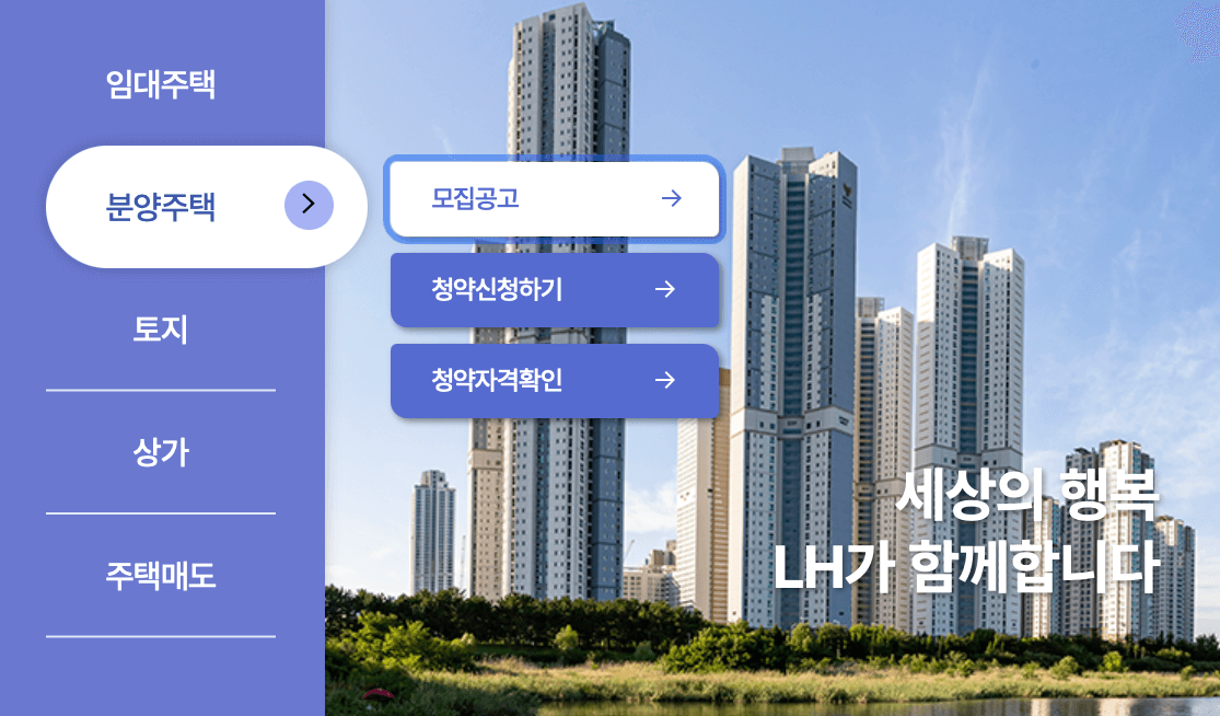 | 임대주택 / 공고문 / 청약신청 | 분양주택 / 공고문 / 청약신청 | 토지 / 공고문 / 청약신청 |