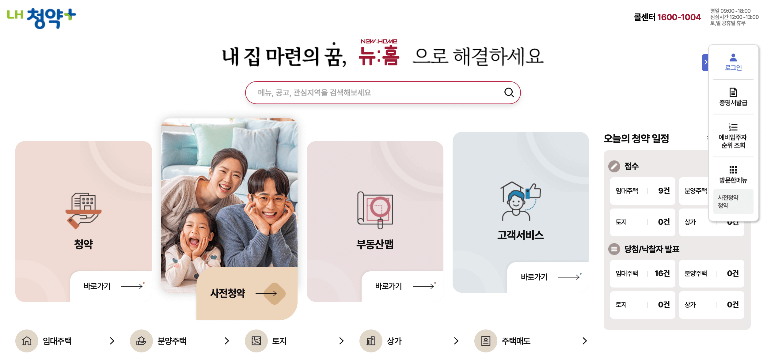 LH 청약플러스 '사전청약'에는 모집공고문 보기, 청약신청내역 조회, 당첨 조회, 증명서 발급 서비스를 이용하실 수 있습니다.