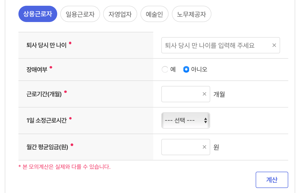 - Step 3 : 해당 항목을 입력하고 계산 결과 확인 (퇴사 당시 나이, 장애여부, 근로기간, 1일 소정근로시간, 월간 평균임금 등)