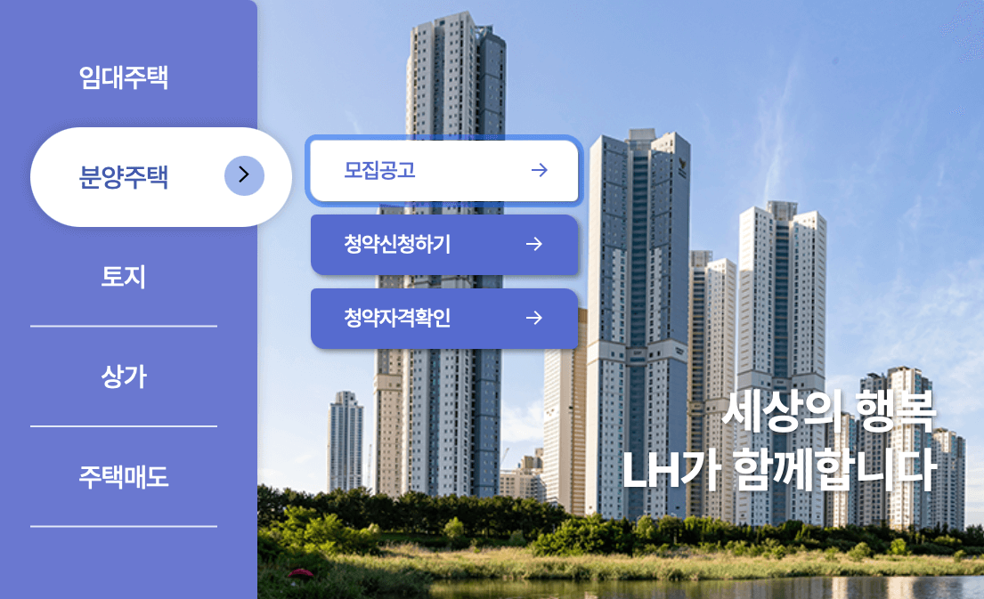LH 청약플러스 '청약'에는 임대주택, 분양주택, 토지, 상가, 주택매도 등에 대한 '모집공고 확인' 및 '청약신청하기' 가능합니다.